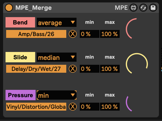 MPE Merge aggregates Bend, Slide and Pressure messages from all active notes, unifying their values into one mappable signal representing the average, median, min or max of the values. This unification creates a smoother signal for mapping to external effects and parameters.